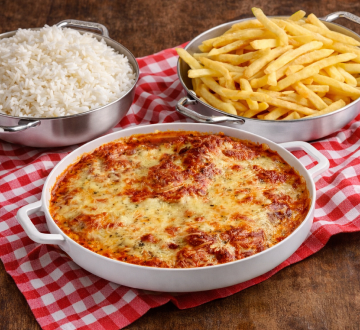 Molho de tomate, mussarela e acompanhado de arroz e fritas