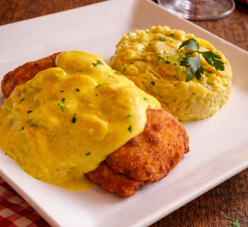 Peito de frango recheado com mussarela, presunto e champignon, acompanha risoto ao molho bechamel e açafrão